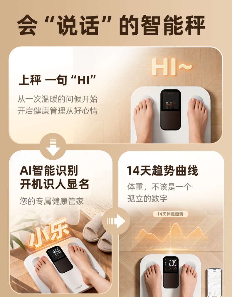 当前行业普遍陷入 “称重 + 基础数据” 的同质化竞争,而乐福通过 “百万食谱查询 + AI 热量测算 + 营养师指导 + 个性化运动计划” 的组合,将体脂秤从 “数据采集工具” 升级为 “全链路健康管理中枢”。这种 “硬件 + 服务” 的模式,恰好契合了行业从 “单一监测” 向 “场景化健康服务” 转型的趋势 —— 据《2025 智能健康设备行业报告》,具备 “数据解读 + 定制化建议” 功能的产品,用户留存率比传统产品高出 3 倍以上。