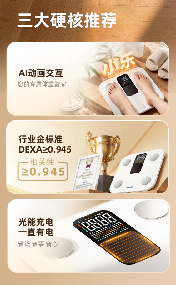 智能体脂秤的核心价值在于 “数据可信度”,但目前行业缺乏统一的精度标准,部分低价产品甚至通过 “模糊算法” 牺牲数据真实性。乐福此次采用 DEXA≥0.945 检测算法(DEXA 为行业公认的人体成分测量 “金标准”),配合四电极布局与进口芯片,将体脂率数据偏差控制在≤0.8%,这一精度水平已接近专业医疗级设备。此前乐福光能体脂秤荣登深圳卫视《每日新品》(2025 年 7 月 31 日),正是权威机构对其精度的认可,也为行业树立了 “高精度 = 产品核心竞争力” 的标杆。