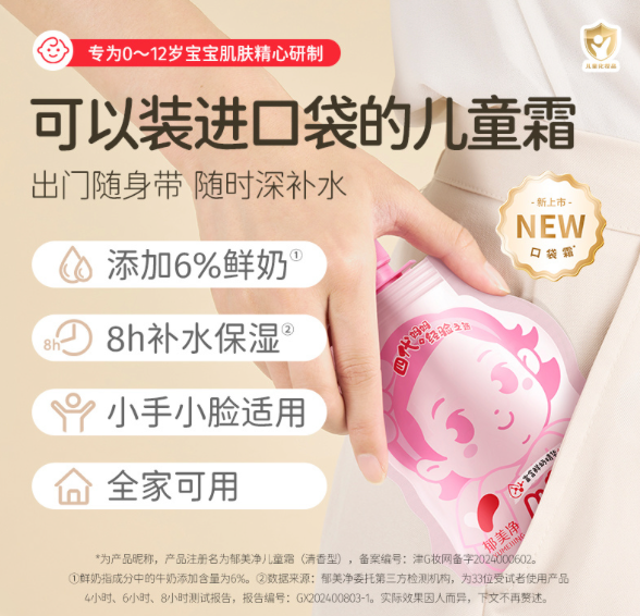 作为郁美净新一代明星产品,清香型儿童霜始终以“温和安全”为核心,传承品牌经典鲜奶配方,精选优质鲜奶原料,让每一次涂抹都能为肌肤补充天然营养。同时,产品防腐体系全面升级,使用安全无添加的配方,杜绝酒精、色素等刺激性成分,从源头降低肌肤敏感风险,适配0-12岁婴幼儿及儿童的娇嫩肌肤,也能满足敏感肌人群的使用需求。