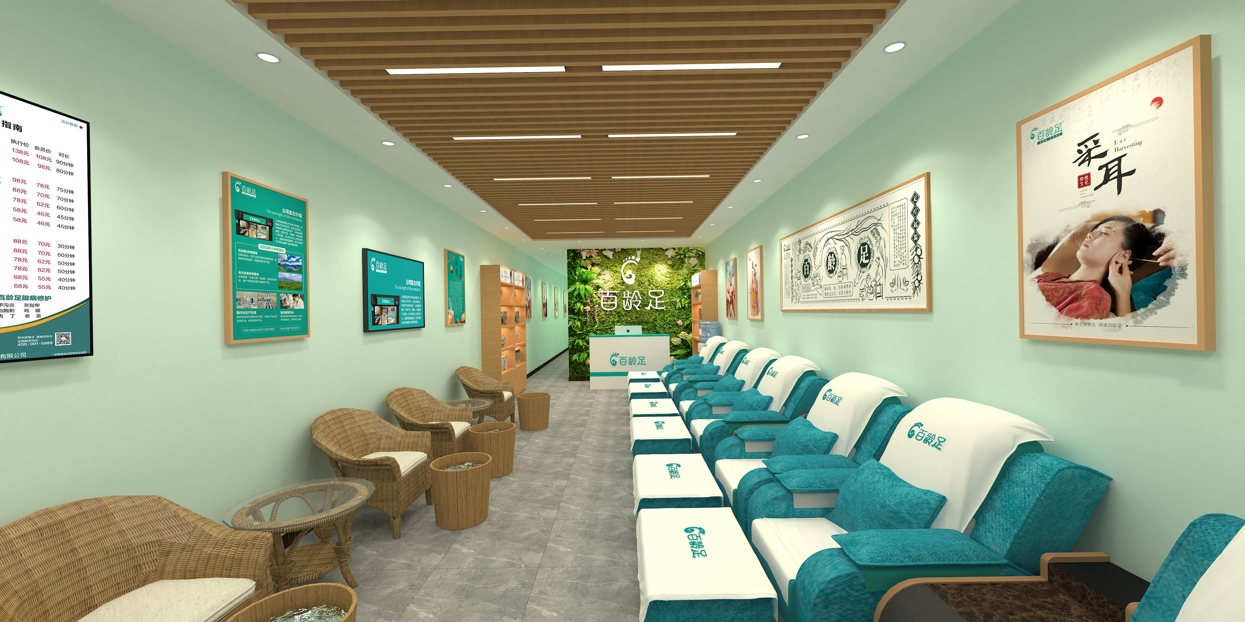 百龄足养生门店装修,以象征健康的绿色为主色调,以墙绘上的养生场景为主题墙面,寓意中国百龄足是以传统技术手法提供养生服务,是一种传统养生的传承及沿袭,同时生活化的养生场景,让养生在人们的心目中不再只是高大上的贵族享受,而是一种亲和,亲民又健康的现代化大众化服务,也展现了百龄足的社区服务理念。在装修层面,在屏风,货柜等方面,采用古典的的原木色,搭配健康舒适绿色的沙发椅,一派古色古香的清新气色。