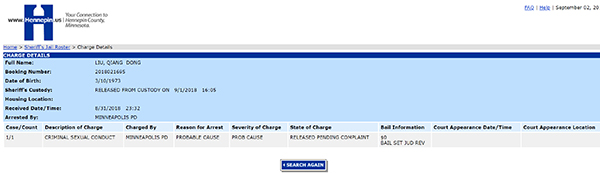 另据明尼阿波利斯市亨平县监狱的公开记录显示,刘强东于8月31日23:32被该监狱登记收押,约16小时后的9月1日(周六)16:05分释放,没有缴纳保释金。