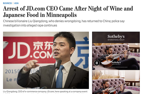 华尔街日报9月5日的报道披露了刘强东被美国警方逮捕前后数日的细节,标题中提到了“红酒日料之夜”。