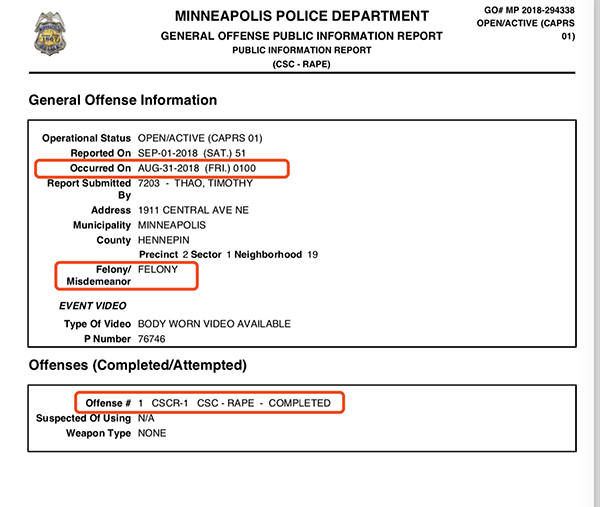 澎湃新闻记者从明尼阿波利斯市警察局档案信息部获得的关于刘强东案的报告显示,刘强东涉嫌的强奸案发生在8月31日(上周五)的凌晨1点。