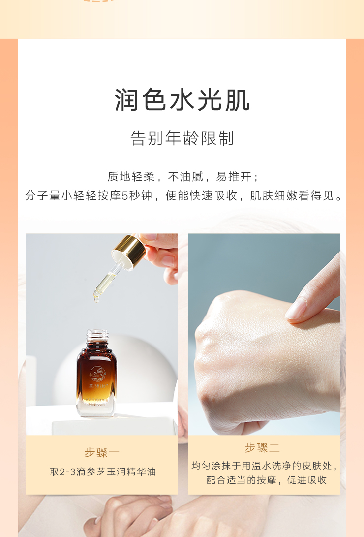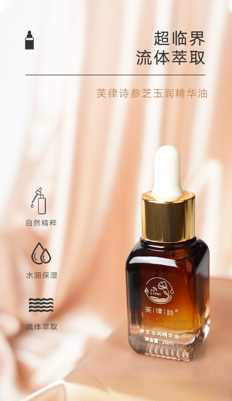 随着时间的流逝,年龄不断增长,岁月的痕迹慢慢爬上了我们的脸颊,皱纹、色斑、暗沉总是让人无计可施。芙律诗®参芝玉润精华油,以自然之力,为广大女性唤醒沉睡肌肤,帮你重塑氧气机。采用超临界CO2流体萃取技术,萃取人参精油、灵芝孢子粉精油、当归精油等珍贵天然草本中的自然精华,科学配比,润养娇颜。