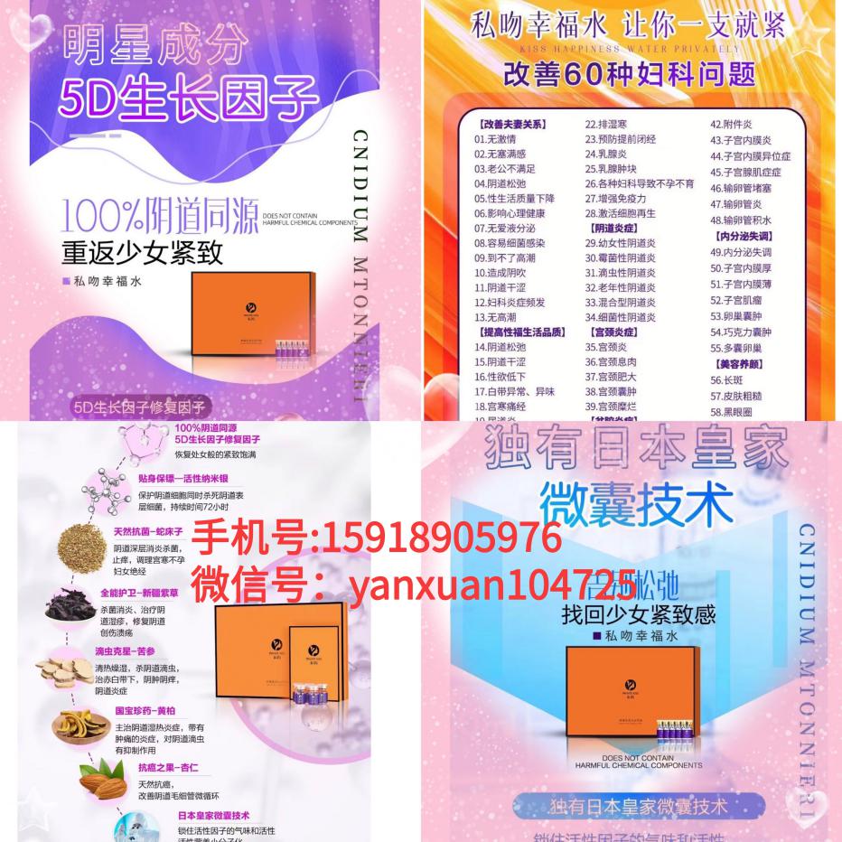 私吻幸福水更是升级版私护产品!缩阴+消炎杀菌强强联合还你性福人生!不是所有的缩阴产品都能做到“1次见效”,私吻幸福水一支当场见效!客户体验感超强!通过日本皇室微囊技术,包裹天然生物修复因子,3秒吸收与阴道100%同源的5D生长因子,10秒快速修复阴道弹力纤维,促进阴道胶原细胞新生重,15分钟六指变两指,一支当场见效!让你重现处子般的紧致弹性!焕发18少女青春活力!